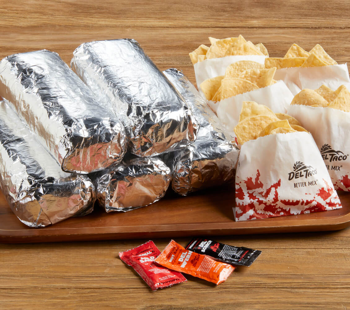 Del Taco offers three catering options to fit any party size! Options include a buffet-style taco option, assorted burrito box, or individual meals. All orders include serving and dining utensils, napkins and a variety of hot sauce packets.